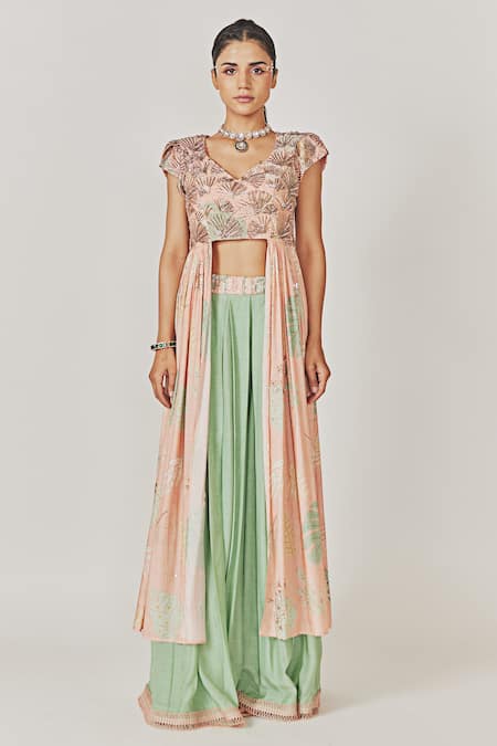 Peach embroidered kurta featuring a V-neck and half sleeves with sequin and cutdana work. Paired with a contrast green flared pant with box pleats and a golden border.
