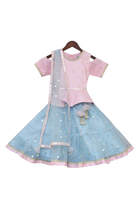 Pink peplum anarkali featuring cold shoulder sleeves and embroidered details. Paired with a net embroidered dupatta.