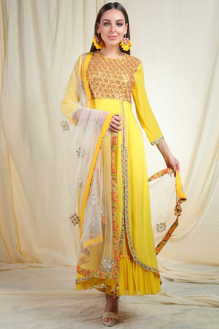 Buy_Nikasha_Yellow Crepe Round Embroidered Anarkali Set _Online_at_Aza_Fashions