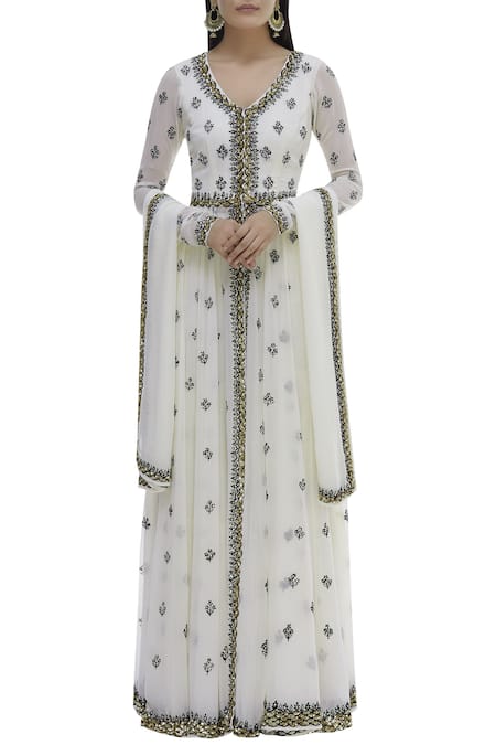 Buy_ASTHA NARANG_White Georgette V Neck Embroidered Anarkali And Sharara Set_at_Aza_Fashions