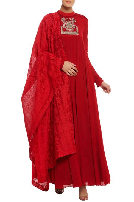 Embrace the vibrant color wheel by splurging on this striking shade embroidered anarkali set. Adorned with detailed intricate embroidery, this opulent red ensemble makes for a beautiful addition.
