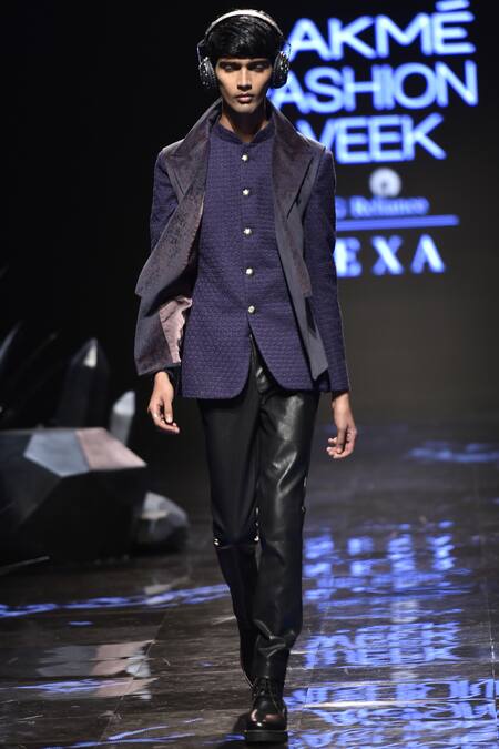 Blue bandhgala with all over work. Come with velvet textured bundi and black leather pants.