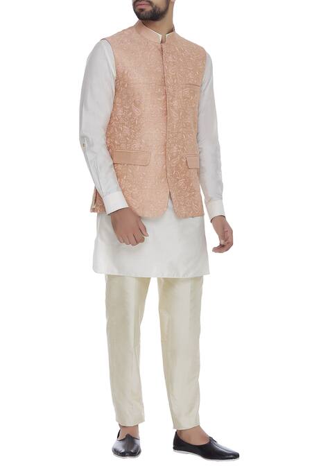Peach bundi with floral motif embroidered all over & flap pockets.