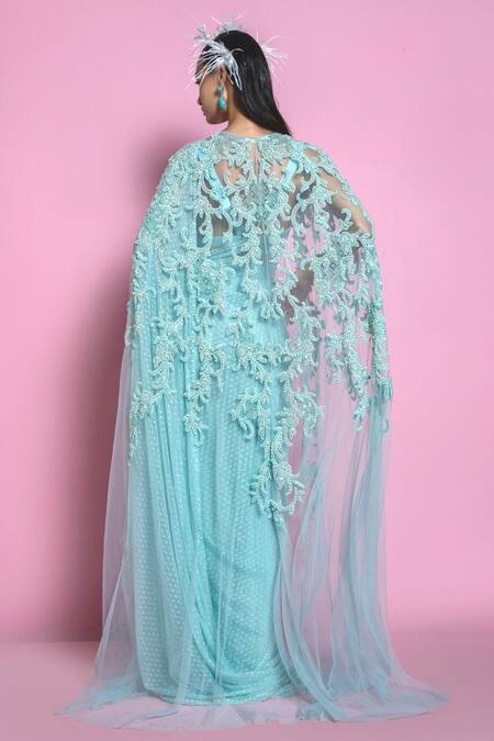 Buy_Mala And Kinnary_Blue Blouse Silk, Cape , Saree Pearl, Bead And Cutdana Embroidered Set_Online_at_Aza_Fashions