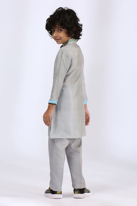 Grey kurta featuring floral embroidery on the collar and side slits. Paired with a matching narrow pant in satin raw silk.