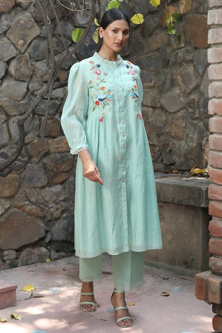 Mint handwoven chanderi dress featuring patchwork and resham embroidered motifs