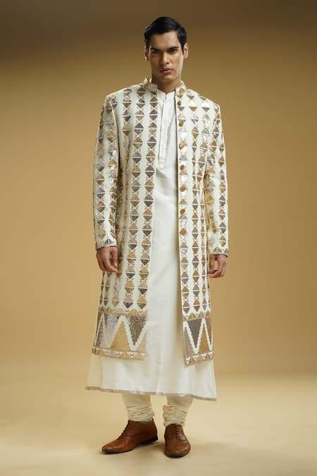 Off-white sherwani featuring gold and silver sequins embroidery with a front buttoned placket. Paired with an anarkali kurta and churidar.