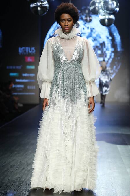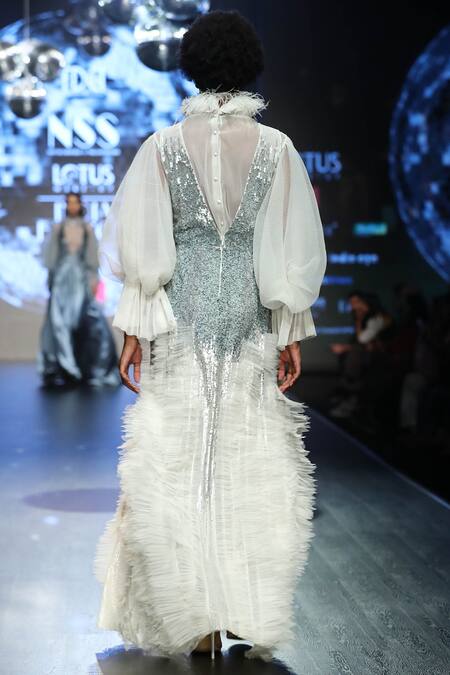 Off-white gown with placement silver sequin work and ruffle detail.