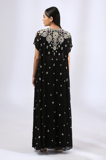 Jet black double georgette open jacket with 3D floral & thread work embroidery. Paired with padded jumpsuit with ring detail.