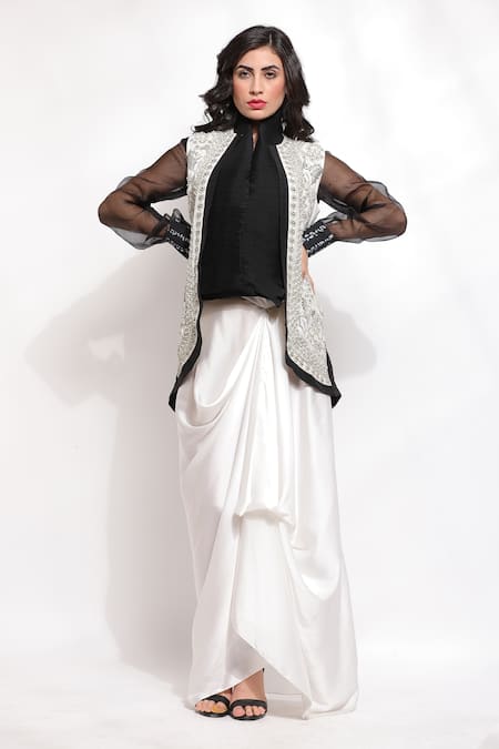 Black & white jacket featuring floral pattern with zari, pearl, and stone embroidery. Paired with a pleated draped skirt and high neck top.