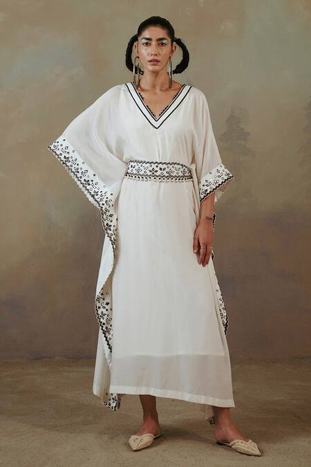 Buy_Sureena Chowdhri_White Muslin Embroidered Thread Work V Neck Kaftan With Belt _Online_at_Aza_Fashions