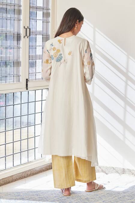 Buy_Vaayu_Ivory Cotton, Muslin Embroidery Round Neck Kurta And Printed Pant Set_Online_at_Aza_Fashions