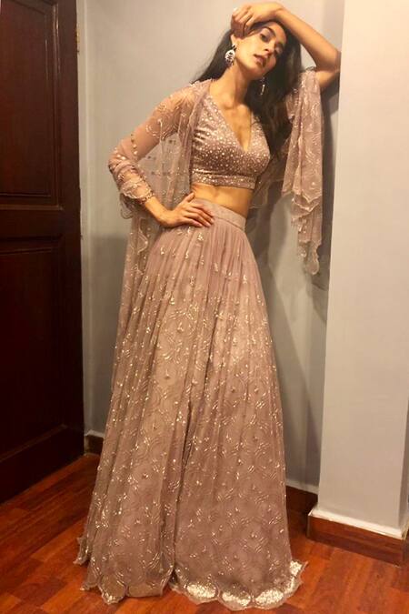 Warm grey lehenga with all-over Mughal motif bead & sequin work. Comes with velvet sleeveless blouse & cutwork dupatta.