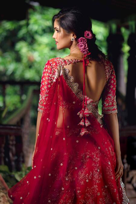 Red lehenga with all-over zardozi floral motif work & scallop hem. Comes with embroidered blouse & net malaika cutwork dupatta.