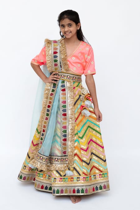 Buy_Fayon Kids_Pink , , Embroidery, Tassels Chevron Lehenga Set _Online_at_Aza_Fashions