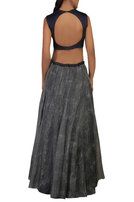 Blue blouse with all-over geometric motif work. Comes with striped lehenga & cutwork border dupatta.