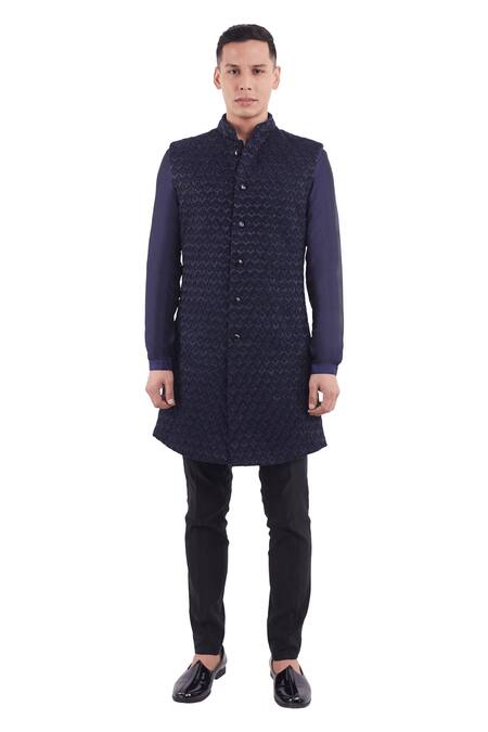 Navy blue longline Nehru jacket with all-over chevron embroidery.