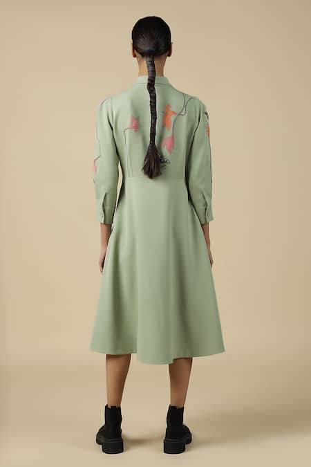 Pista green wrap dress featuring mid summer plant leaves embroidery and fabric covered buttons