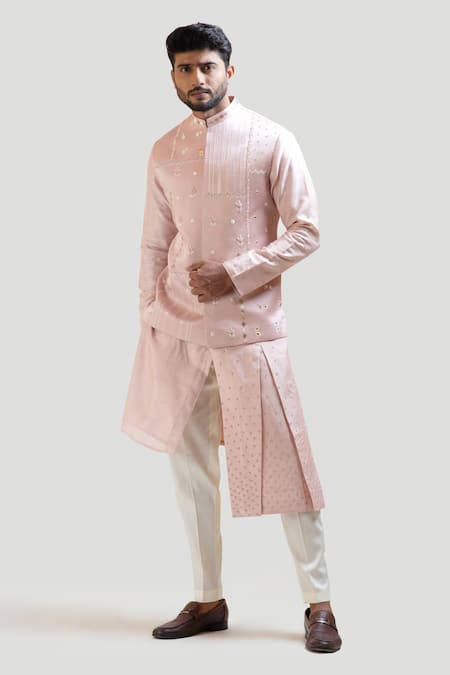 Onion pink box pleated kurta with high and low panels, paired with cream narrow fitted pajama pant. Comes with onion pink Nehru jacket highlighted with mirror work, embellished with bead work and thread embroidery in floral motifs.