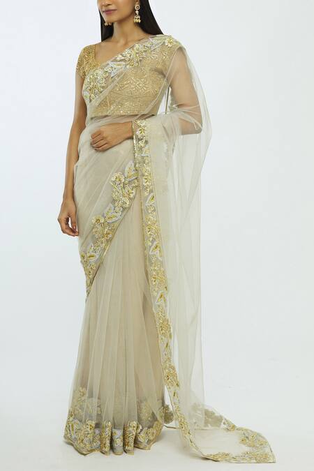 Off White Embroidered Net Saree