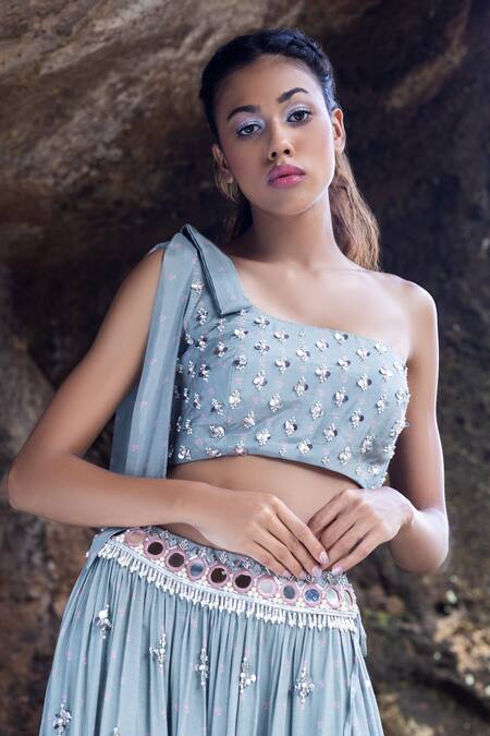 Embroidered mirror waist band, One shoulder tie detail, Tassel details