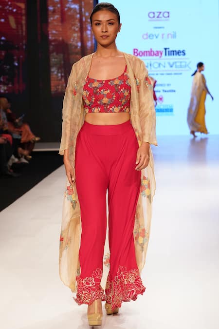 Red palazzo with embellished detail paired with jacket. Comes with embelished crop top.
