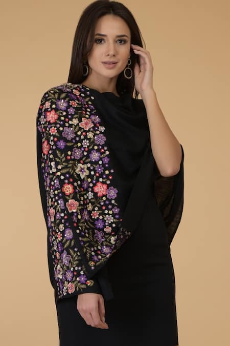 Black Pashmina stole featuring multi-color floral embroidered motifs and sequins