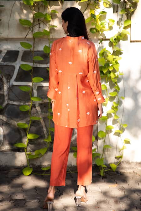 Orange Muslin Embroidered Floral Collared Neck Shirt And Pant Set