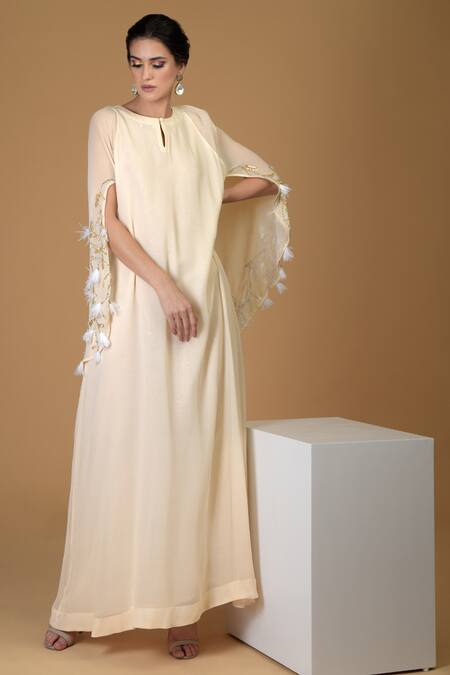 Beige maxi dress with sequin and crystal embroidered motifs on attached cape border.