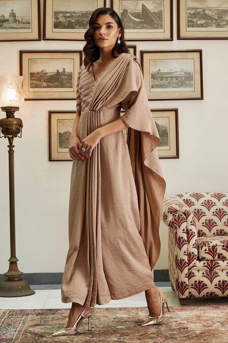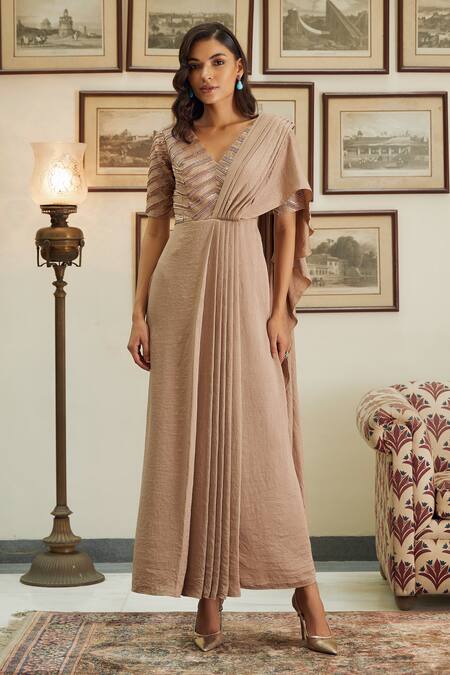 Beige saree gown with cutdana and sequin embroidered motifs on bodice.
