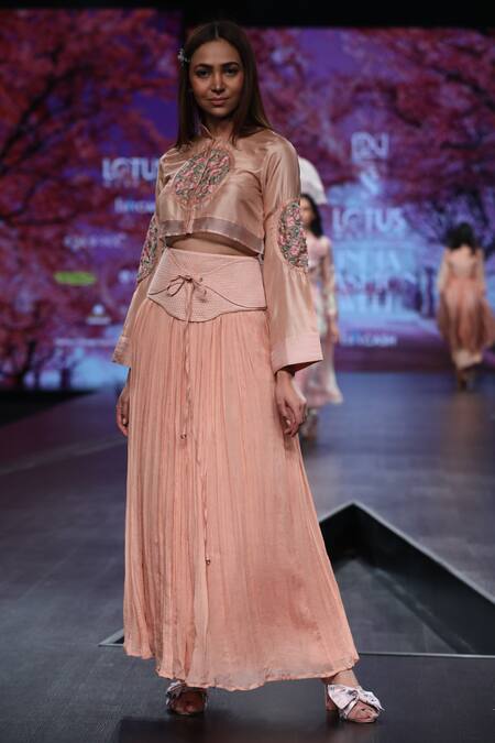 Peach Silk, Organza, Chiffon Band Collar Embroidered Skirt Set