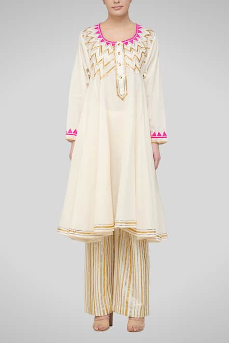 Off-white straight pants with gold-silver tone gota work in striped pattern.