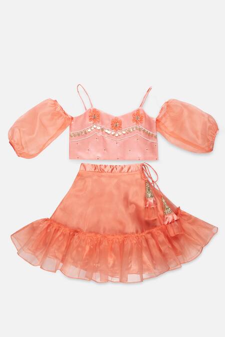Buy_Tutus By Tutu_Peach Organza, Satin, Cotton Embroidery, Sequins Top And Lehenga Set_Online_at_Aza_Fashions
