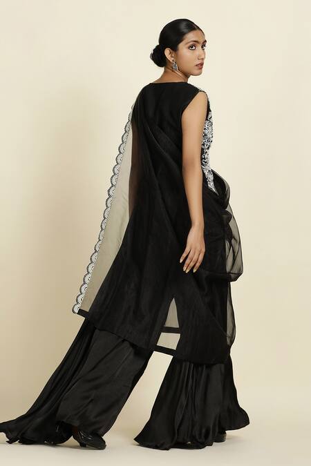 Black waistcoat featuring pearl and thread embroidery in a floral pattern. Paired with high waist palazzo, pre-draped dupatta, and an embroidered belt.