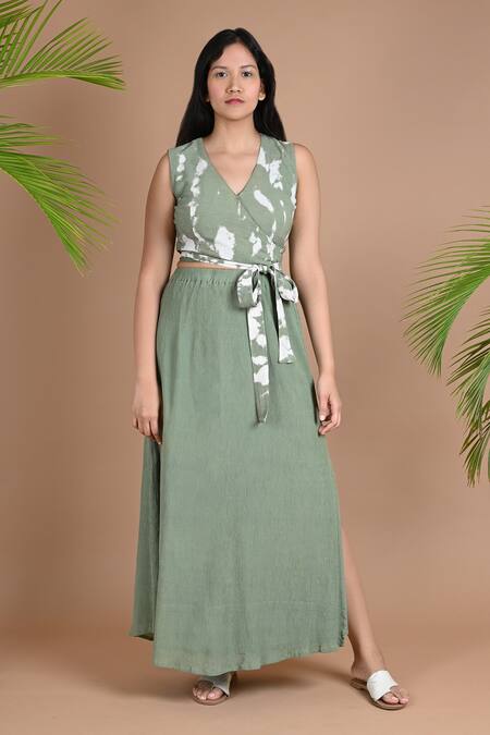 Olive green cropped wrap top with shibori dye detailing. Paired with side slit skirt.