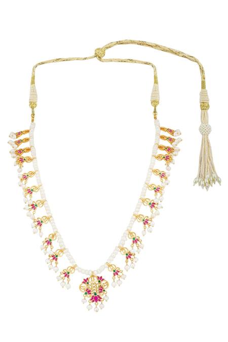 22kt gold dipped necklace with filigree, pink enamelled lotus motifs and pearl drops.