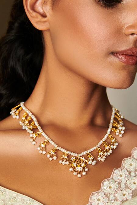 Gold necklace featuring white enamelled lotus motifs and pearl drops