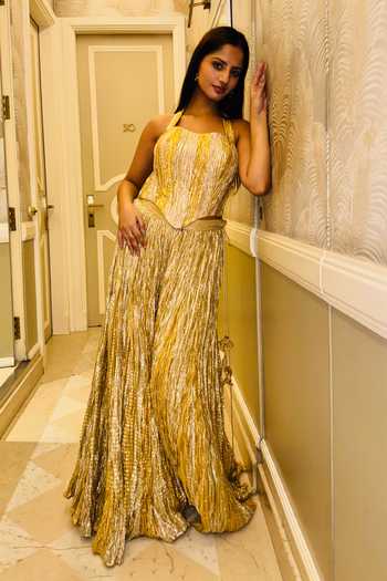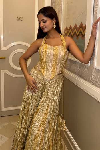Gold Tissue Halter Neck Textured Metallic Corset And Palazzo Set