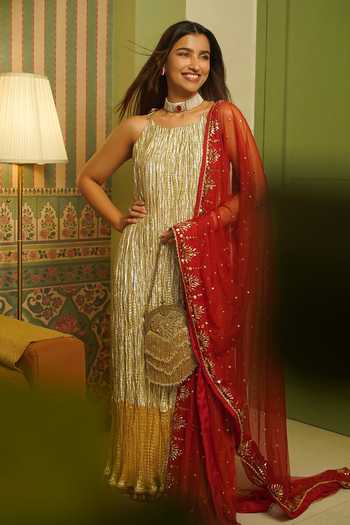 Gold textured metallic kurta with fringe details and a red tulle mukaish dupatta. Paired with red salwar.