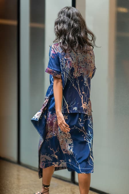 Blue wrap sarong skirt featuring evening canope digital print and stitchline embroidery