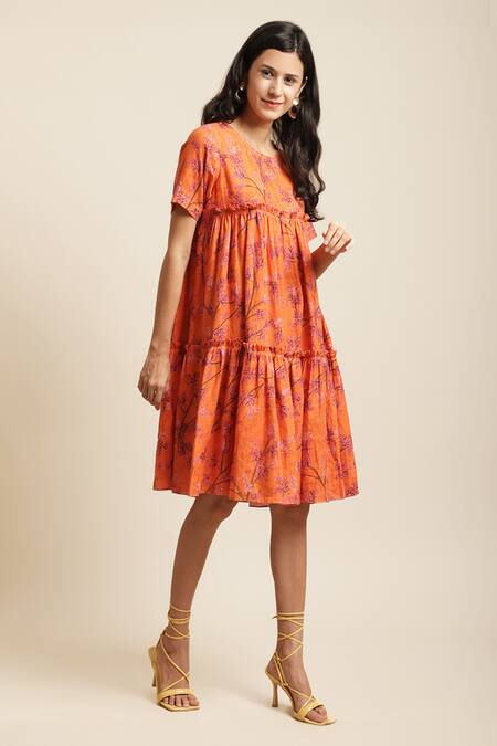Orange dress featuring a tiered flared design with a spring flower print