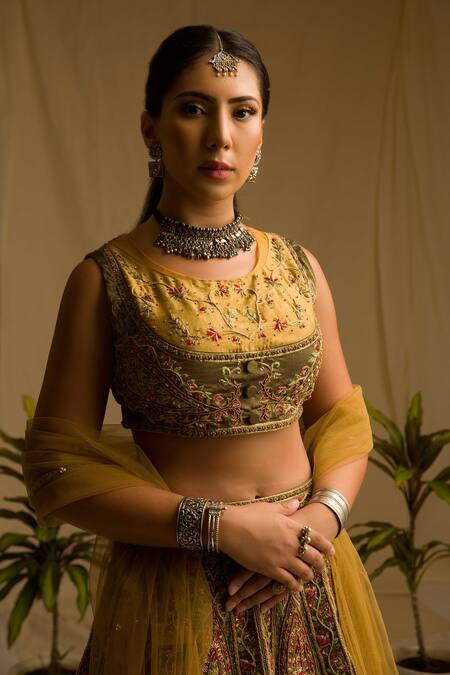 Brown Tulle, Handwoven Kattan Tissue Kashida Faiza Petal Panelled Lehenga Set