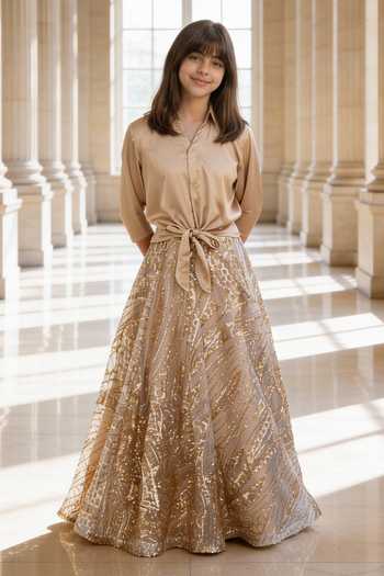 Beige Satin, Net Sequins Shirt With Embroidered Skirt
