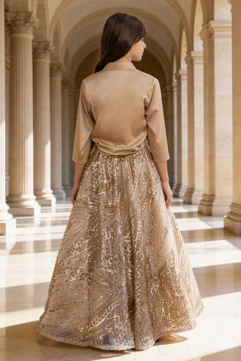 Beige shirt with sequin-embroidered lehenga, a modern take on a classic style highlighting the lehenga's embroidery.