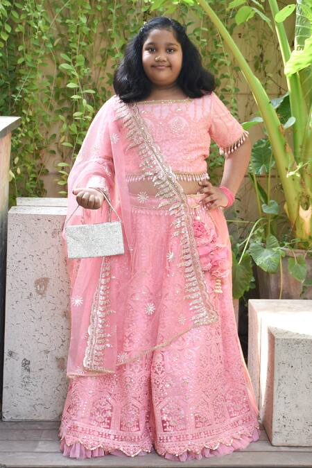 Pink lehenga featuring sequins and thread embroidery. Paired with a matching blouse and an organza dupatta.