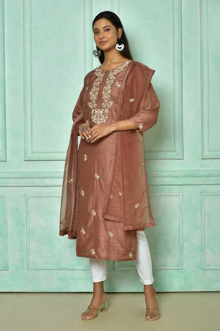 Purple kurta featuring floral embroidery, round neckline, and three-quarter sleeves. Paired with an embroidered dupatta.