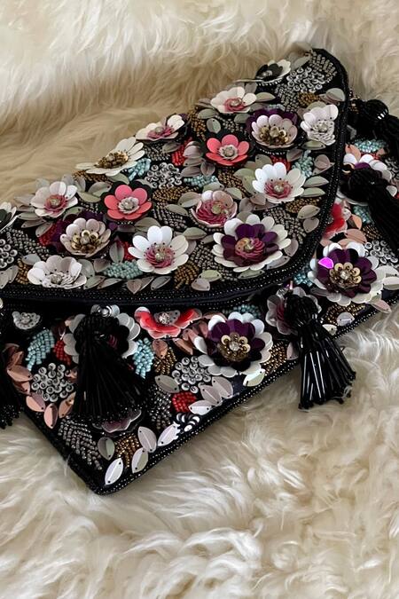 Black clutch bag featuring multi-colored beaded embellishments and 3D floral appliques