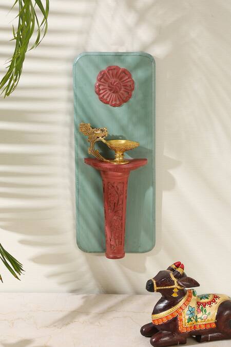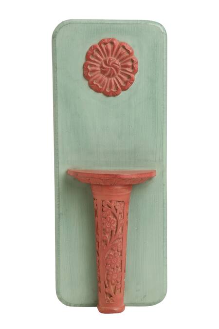 Olive green hand painted wall decor with floral carved motifs & coral red rustic shelf in centre.
