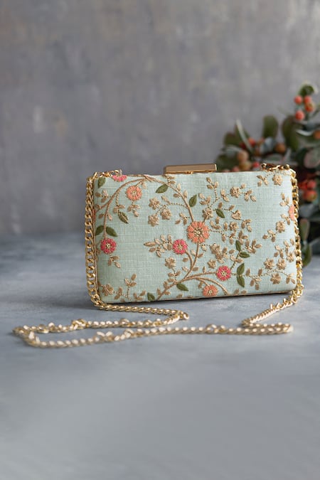 Mint green box clutch featuring floral creeper pattern with zari, resham threads, and sequin embroidery