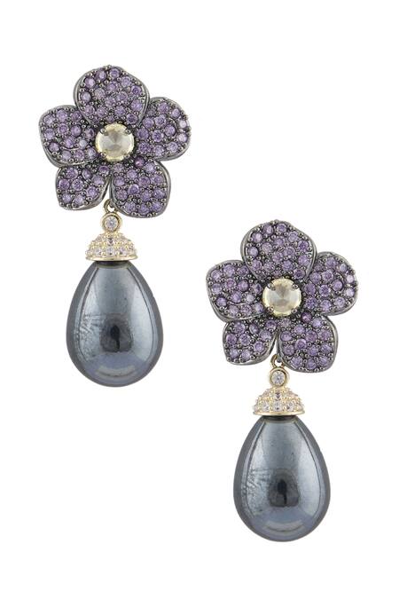 Grey Cubic Zirconia And Pearl Embellished Floral Cut Work Drop Earrings